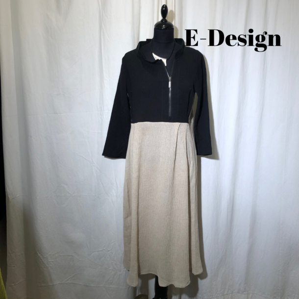 Skøn 2-farvet kjole med langt 3/4 ærme. Kjolen er lavet med en lynlås i øverste del som en detalje. En helt igennem skøn model til både hverdag og fest